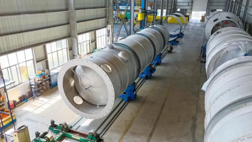 车间挑高约七八米,左右两侧各摆放着三四节巨大的圆柱形塔体。